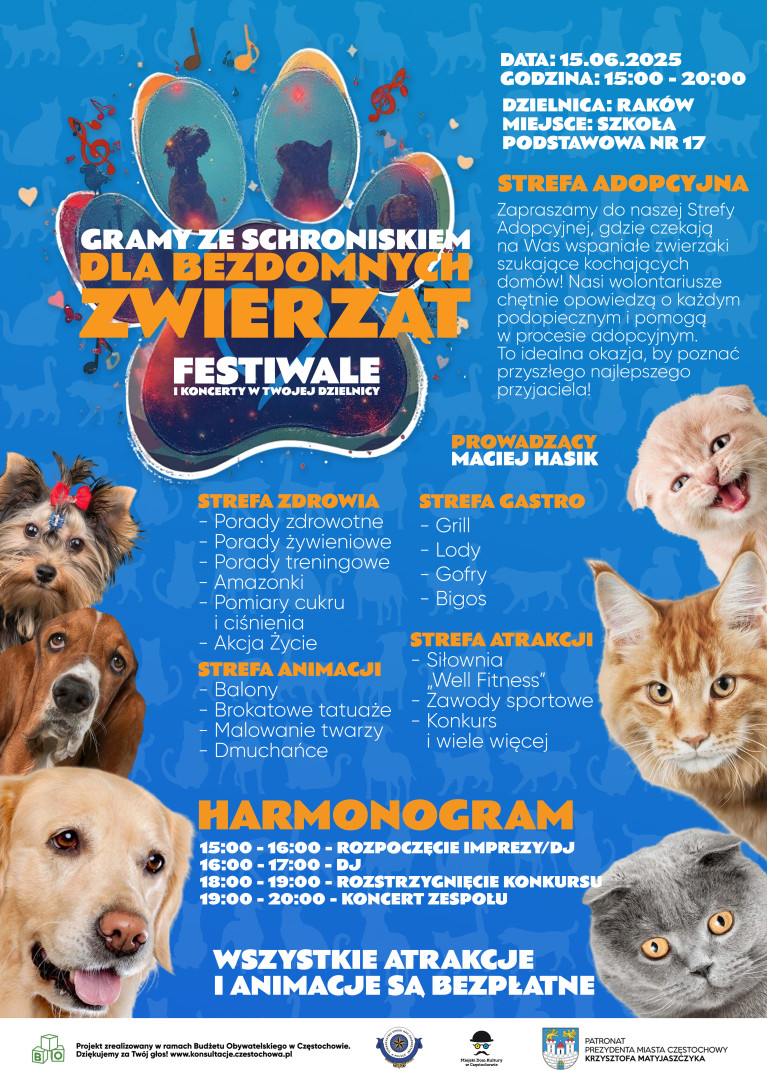 Raków zasługuje na Festiwal organizowany z myślą o mieszkankach i mieszkańcach dzielnicy oraz czworonogów, którzy potrzebują naszej pomocy. Festiwal odbędzie się w 2025 roku i będzie wspaniałą okazją do integracji społecznej oraz promocji budżetu obywatelskiego.